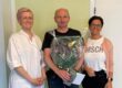 Í miðjuni á myndini sæst Arnold Rasmussen. Til vinstru í myndini er Joan Petersen, næstforkvinna i Felagnum Blóðgeva, og til høgru Claus Reistrup, formaður í Felagnum Blóðgeva.